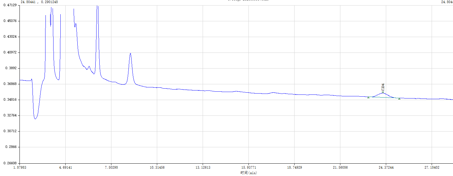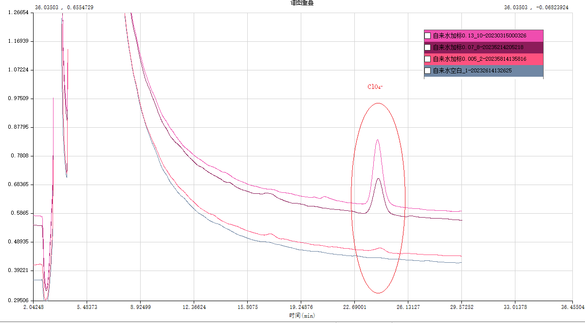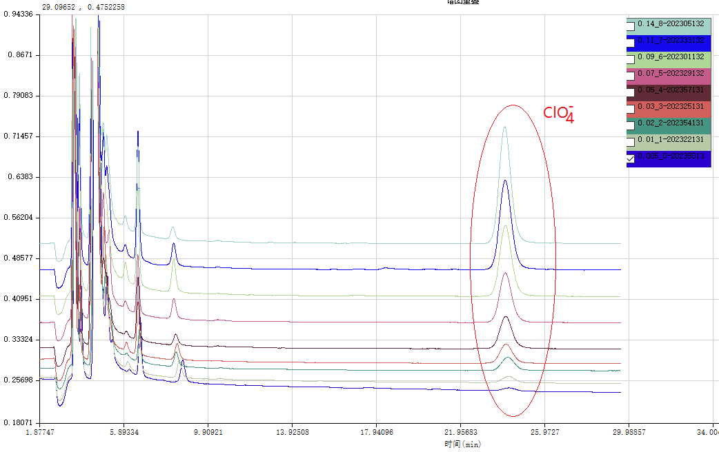 对 3.1.2  中配制的线性浓度点依次进样,得到 ClO 4 - 不同浓度对应的峰面积,见图不同浓度进样对应的谱图叠加图,由ClO4峰面积对浓度进行线性拟合,得到ClO4 - 线性方程Y=1.0483X-0.0036和相关系数r=0.9991。