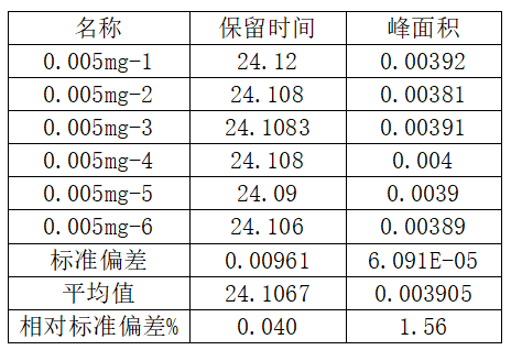 对0.005mg/L 高氯酸盐连续进样6次,图2为0.005 mg/L ClO4-叠加色谱图,得到6次进样峰面积及保留时间的相对标准偏差,见表1,从表1中数据可以看出,低浓度ClO4-的精确度理想。