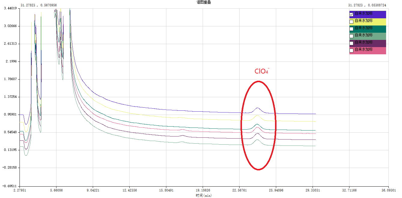 分别对自来水空白样品中加标 0.005mg/L,0.07mg/L,0.13mg/L的 ClO4-,并进样分析见图3,得到对应的实际测得的ClO4-浓度,得到三种浓度水平的回收率数据,见表2,回收率数据在86%-97.8%之间。对自来水加标0.07mg/L样品连续进样6次,得到色谱叠加图4,及表3保留时间,峰面积和浓度的相对标准偏差。