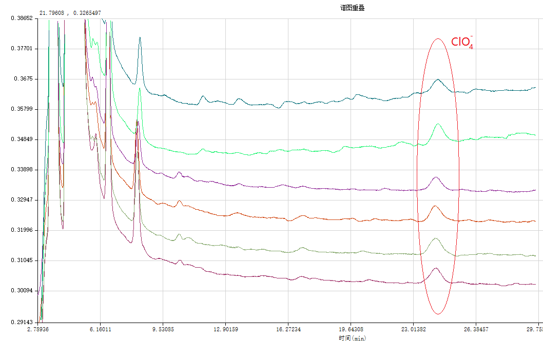 图2  0.005 mg/L ClO 4 - 叠加色谱图