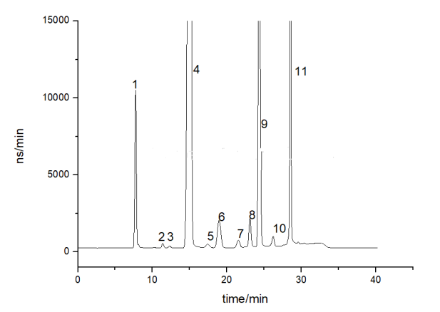 色谱峰mg/L: 1.F-(2.0) 2. ClO2-(0.1) 3.BrO3- (0.1)4.Cl- (5.0)5.DCAA(0.25) 6.NO2-(1.0) 7.ClO3-(0.25) 8.Br-(1.0) 9.NO3- (5.0)10.TCAA (0.5)11.SO42-(10.0)