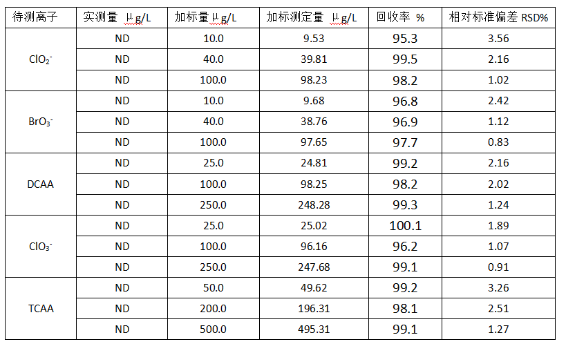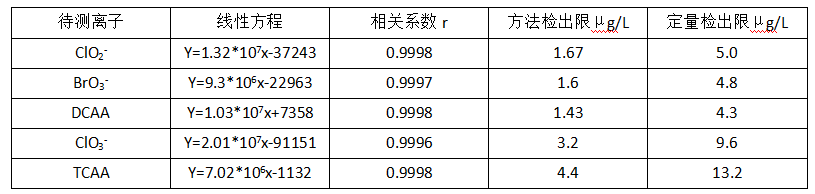 配制5种消毒副产物的系列线性溶液,其中ClO2-(0.01、0.02、0.04、0.1、0.4mg/L),BrO3-(0.01、0.02、0.04、0.1、0.4mg/L),DCAA(0.025、0.05、0.1、0.25、1.0mg/L), ClO3-(0.025、0.05、0.1、0.25、1.0mg/L),TCAA(0.05、0.1、0.2、0.5、2.0mg/L),分别进样,得到对应的峰面积,以峰面积对浓度绘制线性标准曲线,分别得到5种消毒副产物对应的线性方程和线性相关系数。通过使用高容量的色谱柱及大体积进样,提高检测的灵敏度,选择适合的低浓度混合标准溶液重复进样10次,计算出标准偏差SD.3倍SD为方法检出限,10倍SD为定量检出限。通过表2中的实验数据可以看出,线性和检出限均满足痕量目标污染物的检测需求。