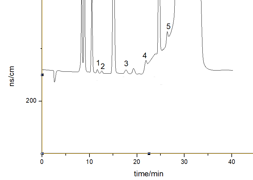 色谱峰:1. ClO2- 2. BrO3- 3. DCAA 4.ClO3- 5.TCAA
